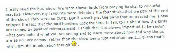 A World of Wings also act as consultants to existing displays and presentations within parks and zoos. Previous jobs have included staff training and animal behaviour training for clients such as West Midland Safari Park and Tropical Wings Zoo.